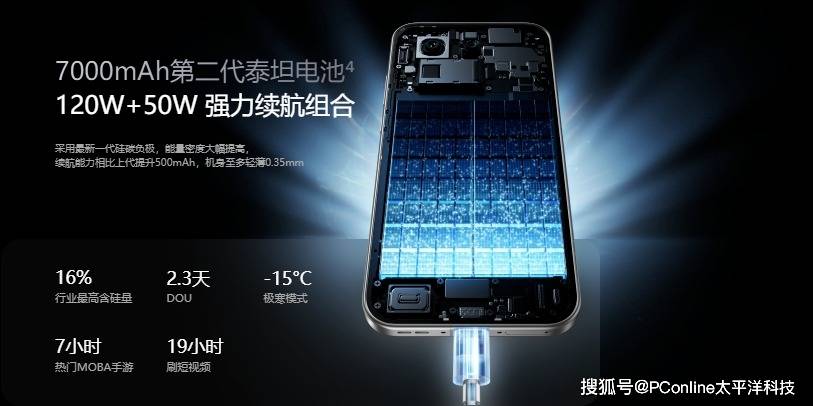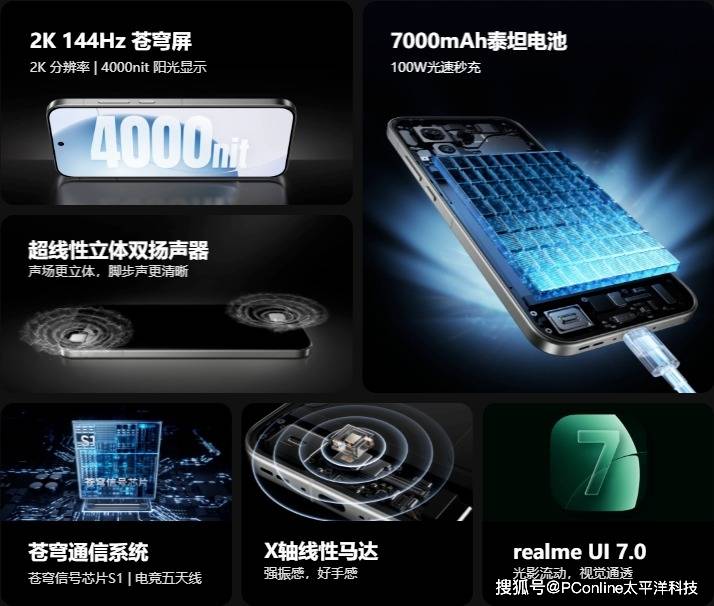 真我GT8 Pro内置7000mAh第二代泰坦电池,支持120W有线闪充与50W无线闪充,15分钟充至50%。机身厚度较上代减少0.35mm,兼顾轻薄与持久续航。苍穹通信系统优化信号调度,使蜂窝游戏信号提升25%,在弱网环境下依然稳定流畅。