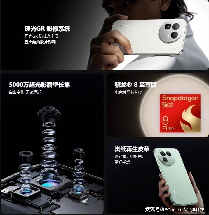 真我GT8标准版同样搭载骁龙8至尊版与电竞独显芯片R1组合,配备5000万超光影潜望长焦及理光GR影像系统,带来旗舰级拍摄体验。
