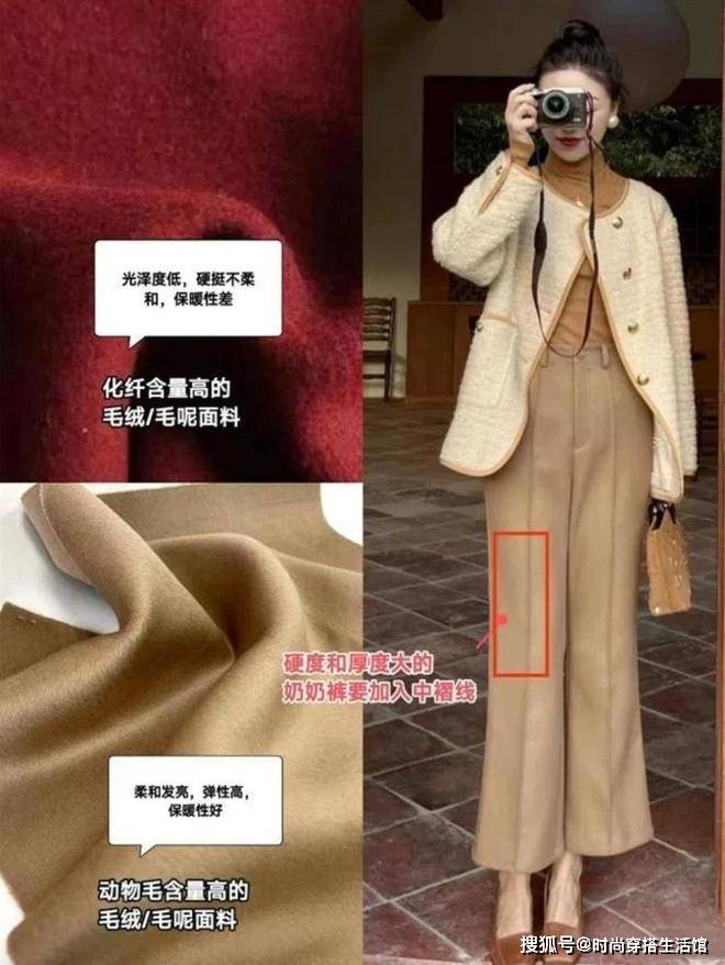 当然,最考验眼光的还是面料。在挑选面料时,要选动物毛含量高的毛绒或毛呢类面料,这类材质柔和发亮、弹性高且保暖性好。 若面料的化纤含量过高,低光泽、过硬触感则会让奶奶裤充满塑料感。且硬度和厚度大的面料,要在奶奶裤中加入中褶线才利落哟~