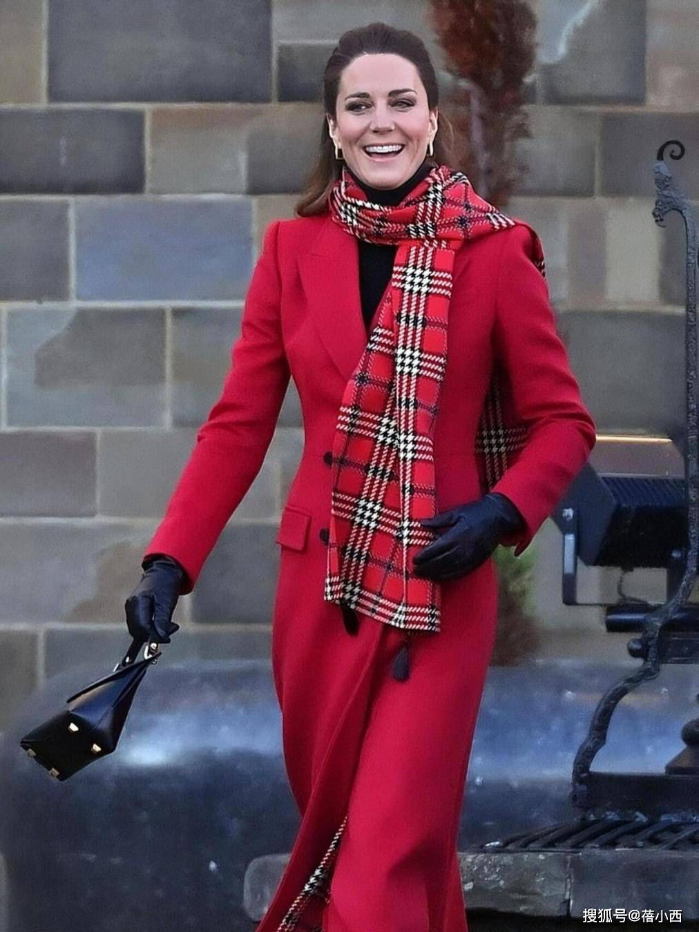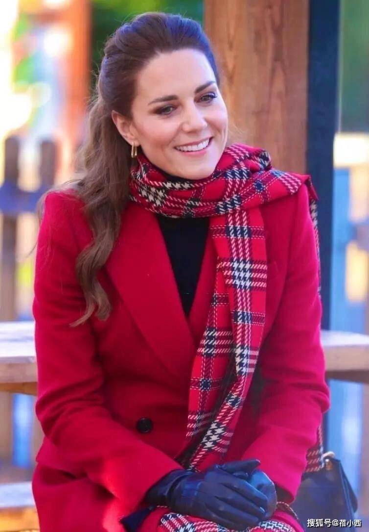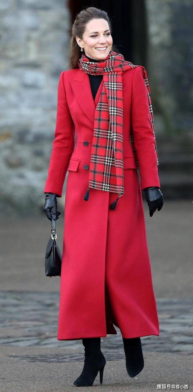 针对红大衣的穿搭,主要涉及到三身。我们先来看第一套造型,身上这件大红色大衣衣摆长度逼近脚踝,这就缩小了适穿人群。凯特王妃的官方身高是175cm,穿这种长款大衣不用怕压个字,腰板挺直走路时反而很有气场。因为天气冷的缘故,脖子戴着一条围巾,其颜色以红色为主,与大衣同时出现显得十分喜庆。