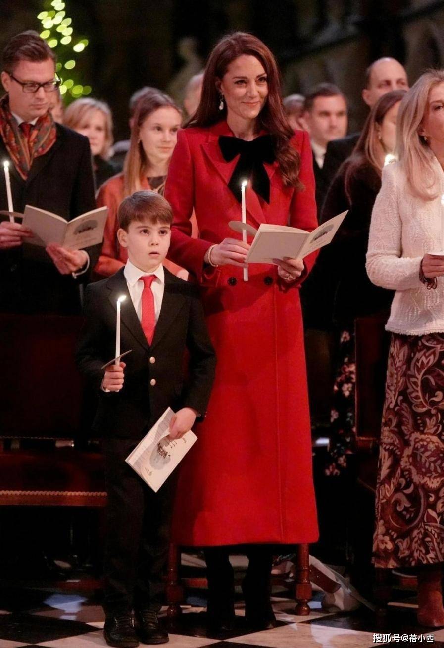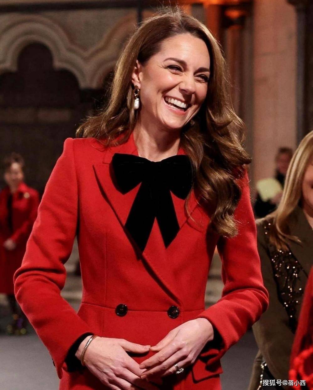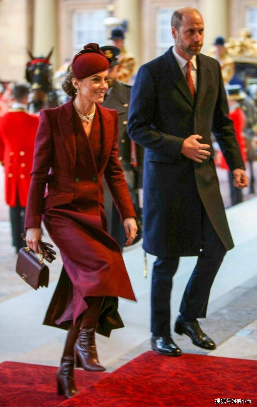 针对红大衣的穿搭,主要涉及到三身。我们先来看第一套造型,身上这件大红色大衣衣摆长度逼近脚踝,这就缩小了适穿人群。凯特王妃的官方身高是175cm,穿这种长款大衣不用怕压个字,腰板挺直走路时反而很有气场。因为天气冷的缘故,脖子戴着一条围巾,其颜色以红色为主,与大衣同时出现显得十分喜庆。