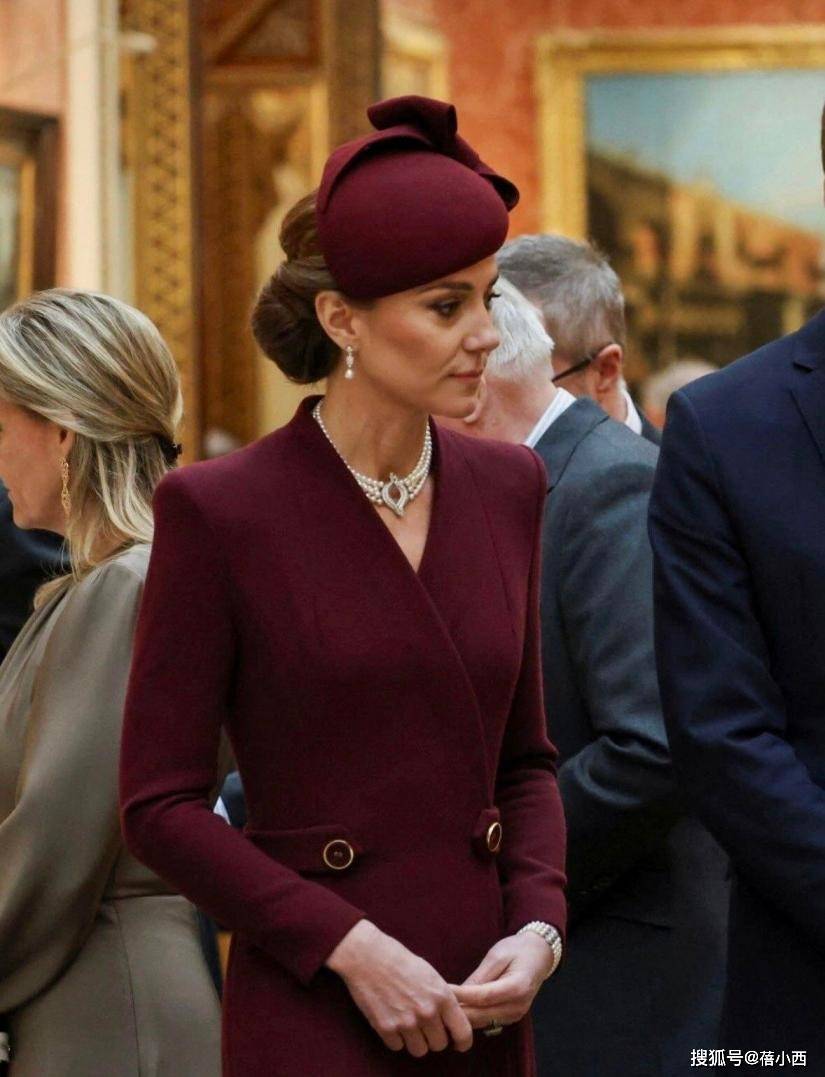 为了保证整体造型在颜色上的和谐度,凯特王妃所戴帽子与大衣颜色相同。两者的颜色虽然是红色,但视觉上不太亮,偏暗沉。这件暗红色大衣更加适合30+以上人穿,此色自带成熟感。