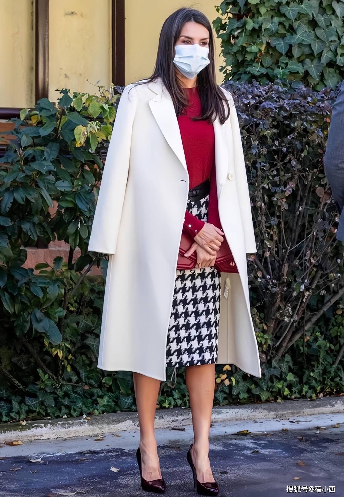 西班牙王后在很多场合都穿着过膝裙搭配大衣,不同于短裙的俏皮灵动,过膝裙自带沉稳端庄的气质,长度恰好落在膝盖下方5-10厘米处,不会过于拖沓,又能恰到好处地修饰腿部线条,藏起身材短板。