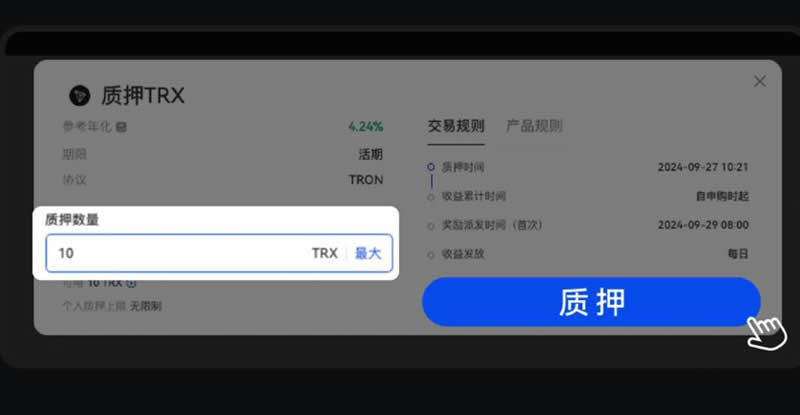 3、输入你想要质押的TRX数量,然后点击“质押”按钮,这样就完成了TRX的“挖矿”操作。
