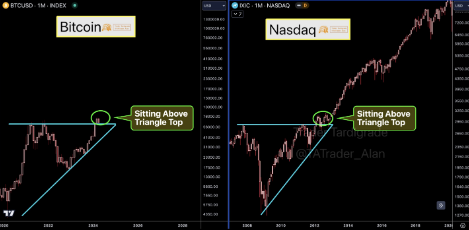 此外,交易员 Alan Tardigrade 对比特币的月度走势图持乐观态度。他认为,比特币仍然位于三角形顶部之上,这是一个非常积极的信号。为了未来的长期牛市,市场的盘整是必不可少的。