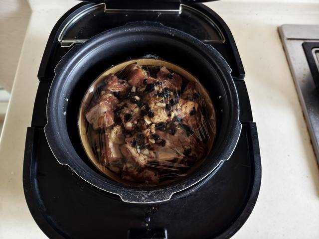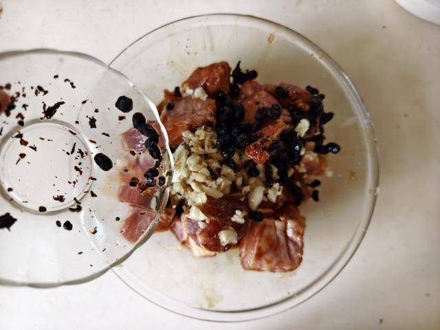 制作过程: 1. 将肋排剁成麻将大小的块(这样更易成熟入味),加入少许盐、料酒、生抽、豆豉、姜末和蒜末等调味料拌均匀腌制30分钟;