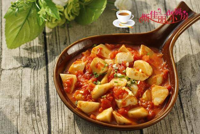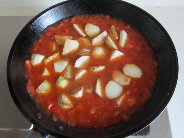 3. 将准备好的芋头放进番茄汁中焖煮3分钟, 将其煮至软糯入味即可。