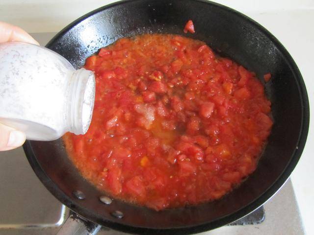 2. 将番茄去皮后切成细小的番茄粒备用; 烧热锅放入适量的油,加入番茄粒炒至微微出汁(番茄用油煸炒过更利于番茄红素的吸收),加入少许水焖煮,再放入1小勺糖提鲜,适量的盐调味;