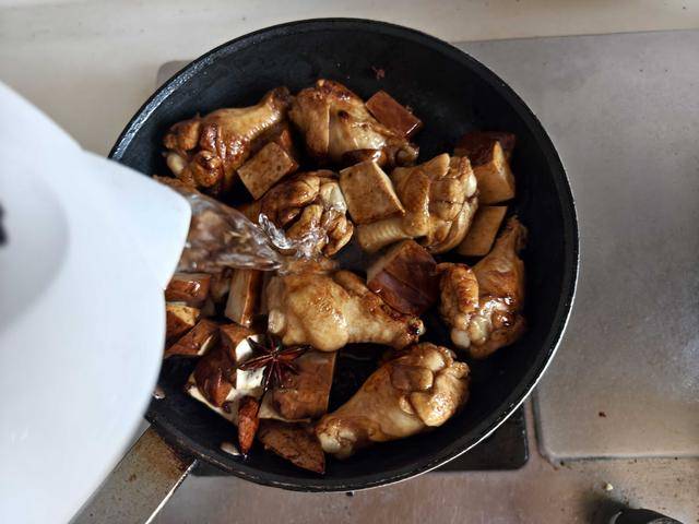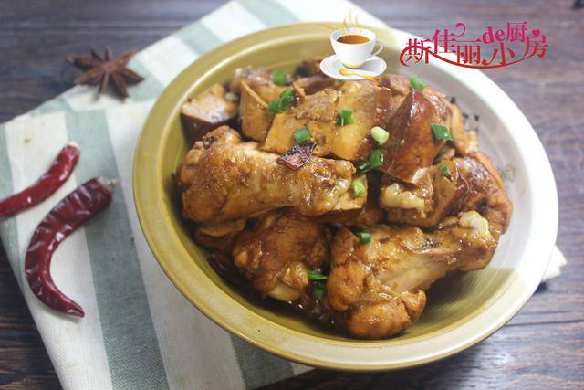 准备原料: 香干 3块 鸡翅根 6个 姜片 3片 八角 1个 香叶1片 桂皮1小块 生抽 1勺 料酒 1勺 葱花 少许 油盐 适量