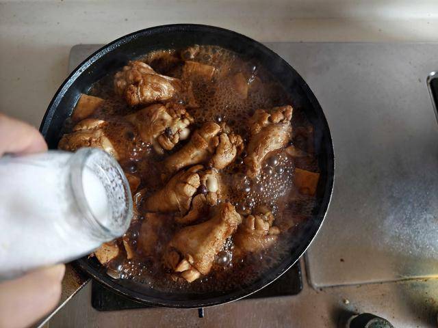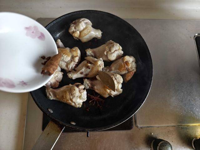 制作过程:1. 烧热锅放入适量的油,加入鸡翅根放进锅中去煎,将其双面煎至金黄后加入少许姜片和大料放进锅中翻炒几下;