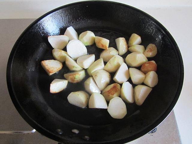 制作过程:1. 将芋头去皮后切成滚刀块备用; 热锅凉油,将芋头块放进锅中翻炒至表面微微金黄;