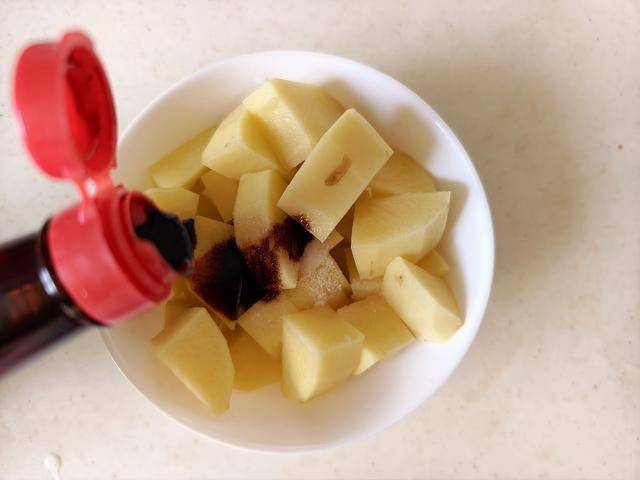 2. 将土豆去皮后切成排骨大小的块加入少许盐和生抽拌均匀腌制10分钟;