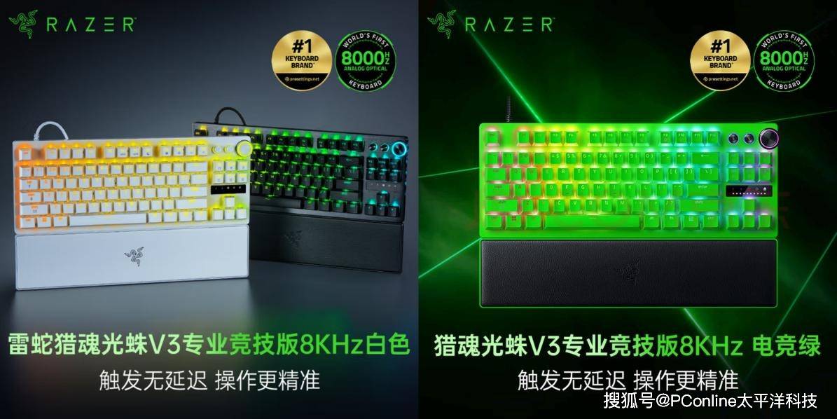 想要在游戏中快人一步、制胜赛场?主会场中的这几款电竞装备是不二之选。雷蛇猎魂光蛛V3专业竞技版8KHz 游戏键盘搭载第二代模拟光轴,配合8000Hz轮询率,响应速度快至0.58毫秒,稳定性也完胜磁轴。其快速触发模式支持0.1mm按键重置灵敏度,确保每个操作都精准响应。经过优化的轴体结构搭配加厚消音棉,有效消除杂音,双色注塑PBT键帽与磁吸手托更带来舒适体验,助力玩家在竞技中所向披靡。
