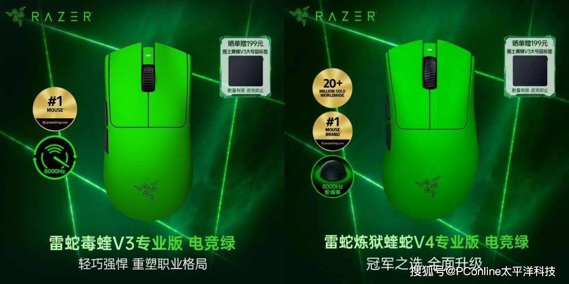 鼠标作为电竞操作的另一关键装备,同样备受关注。雷蛇毒奎V3专业版无线鼠标轻至54克,搭载业界领先的Focus Pro 35K光学传感器,配合HyperSpeed无线技术,在保证极致轻量化的同时,实现精准追踪与稳定连接。雷蛇炼狱蝰蛇V4专业版无线鼠标配备更先进的Focus Pro 45K光学传感器与原生8000Hz轮询率,配合第四代光学微动带来超过1亿次点击寿命,在约150小时超长续航的加持下,确保玩家在持久对战中始终保有竞争优势。