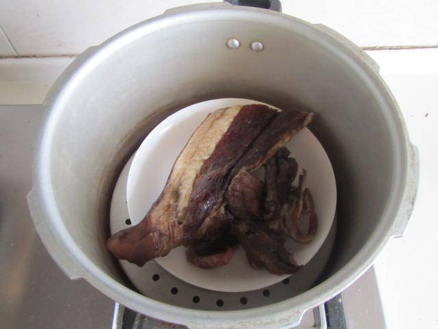 制作过程:1. 将整块腊肉用热水清洗干净, 放在盘中,放入蒸锅中大火蒸上二十分钟,蒸好后放至微凉切成片备用;