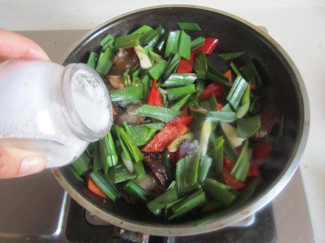 4. 再加入准备好的红椒片,微微变色后加入少许盐调味(注意腊肉已经有咸味,要控制好盐量), 翻炒均匀后盛入盘中。