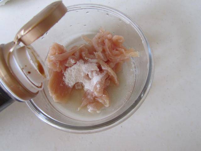 制作过程: 1. 将鸡脯肉切成细丝后加入少许盐、淀粉、生抽和料酒等调味料拌均匀腌制3分钟备用;