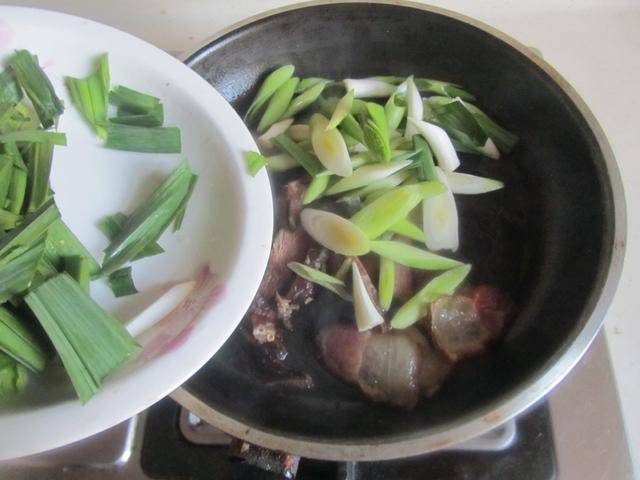 3. 青蒜洗净后切成小段,将青蒜放进锅中翻炒几下;