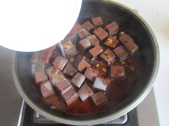 2. 加入少许水焖煮,加入准备好的鸭血块进锅去煮上两分钟,加入少许盐调味,再加入少许水淀粉勾芡;