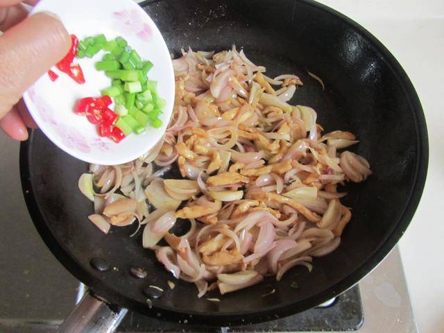 4. 最后加入少许蒜苗末和红椒圈放进锅中翻炒几下,盛入盘中。