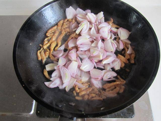 2. 将洋葱切成细丝备用; 烧热锅放入适量的油,将腌制好的鸡肉丝放进锅中翻炒至微微变色; 再加入洋葱丝放进锅中翻炒;