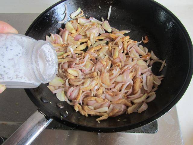 3. 洋葱微微翻炒出香味,加入少许盐翻炒均匀;
