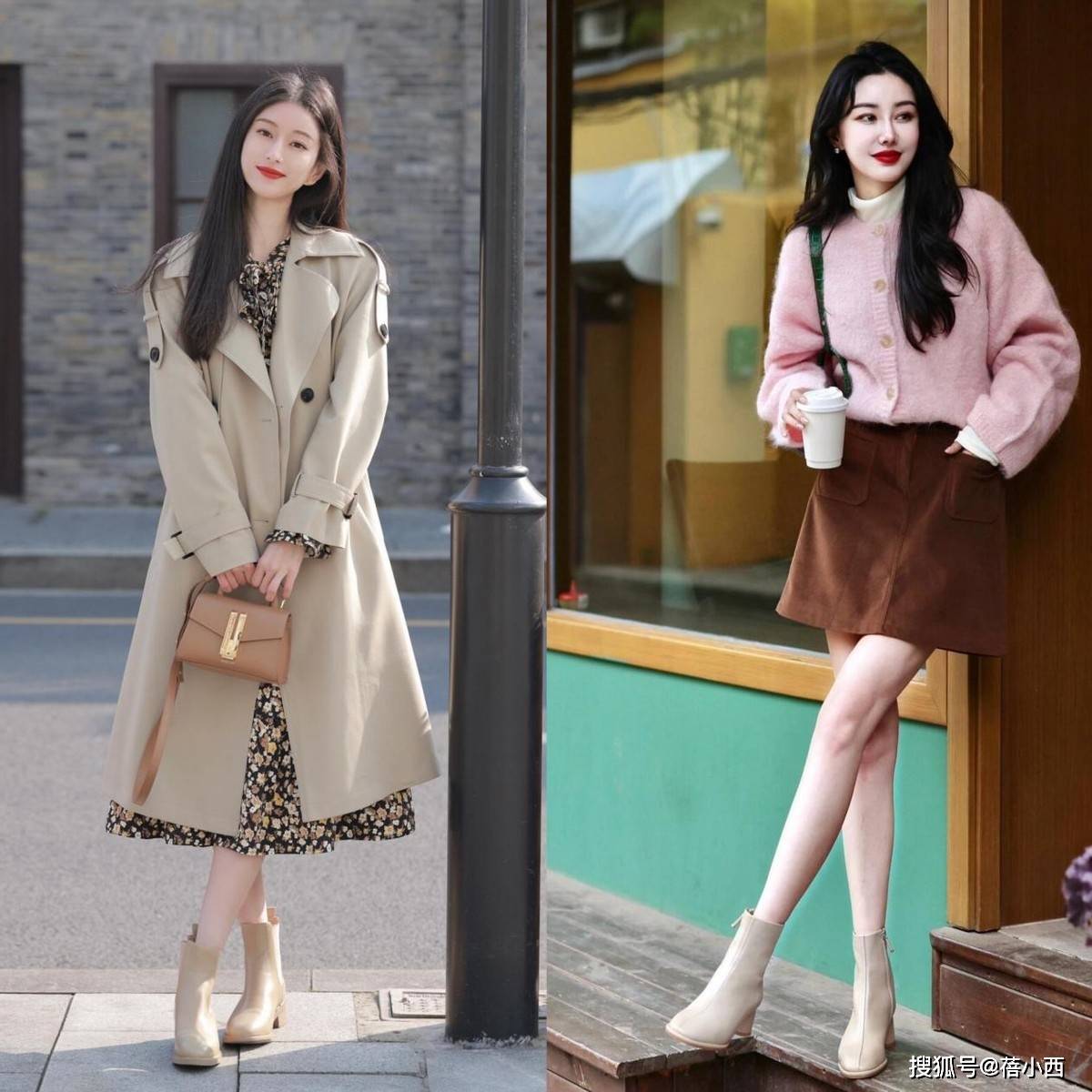 如果你的穿衣风格比较温柔,那么你也可以尝试这种浅色的短靴,像下面这种米色系的短靴搭配上风衣或者是毛衣,都能够让女人味展现出来,而且浅色的靴子量感比较轻,穿在身上也不会显得太厚重,露出双腿肌肤,回头率绝对会爆棚。