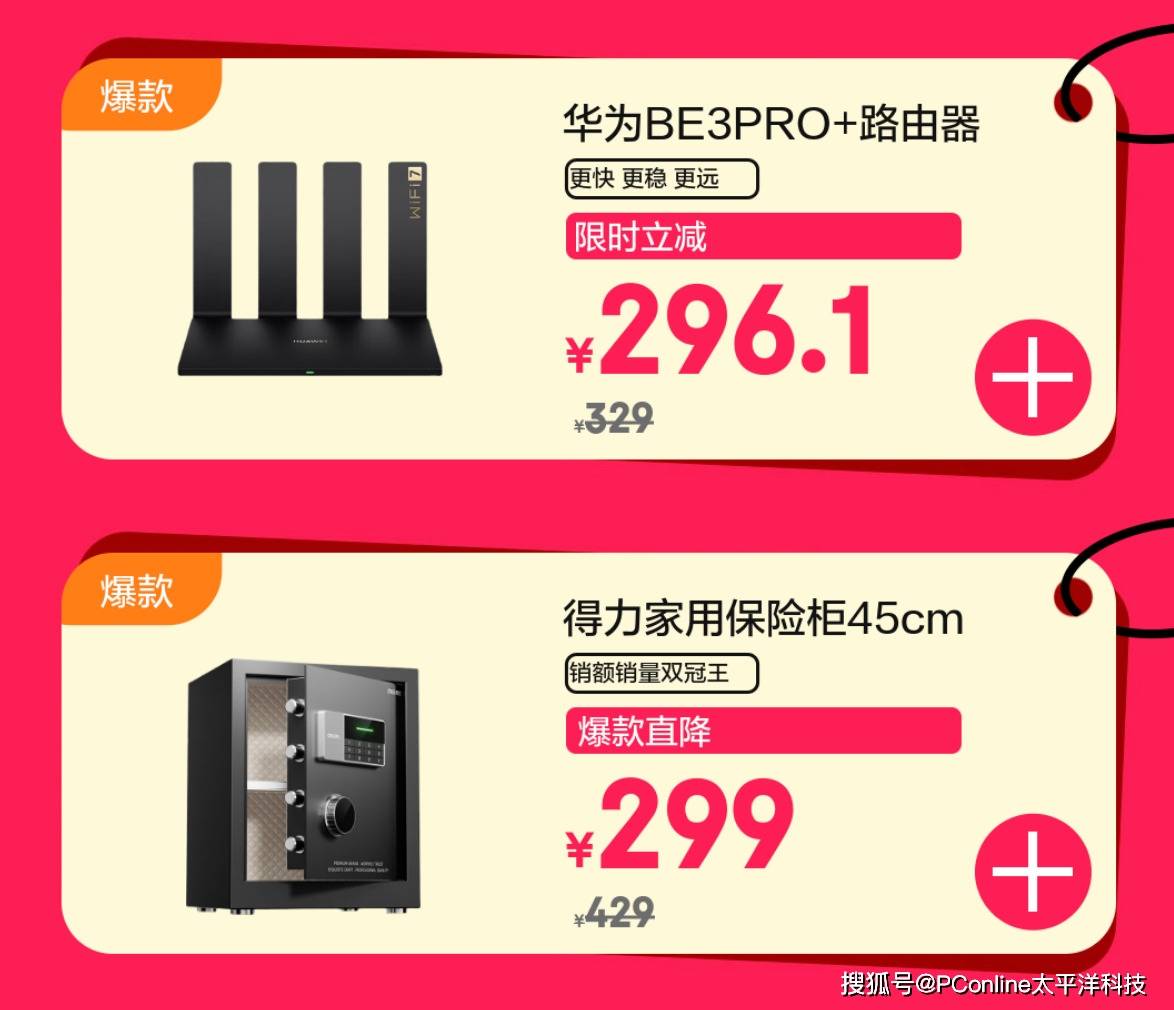 守护商业机密与核心资产,是办公场景不可或缺的一环。得力保险柜专为办公场景设计,其加厚钢板和C级锁芯能妥善保管合同、公章及机密文件,原价429元,活动价299元。定流畅的网络,同样是现代办公场景下的刚需。华为BE3PRO+路由器搭载Wi-Fi 7技术,办公室多设备同时在线也不卡顿,穿墙性能出色,原价329元,9号限时价296.1元。华硕RT-AX86UPro路由器适合大户型办公区,160MHz频宽让每个房间都信号满格,原价1299元直降600元,活动价599元。