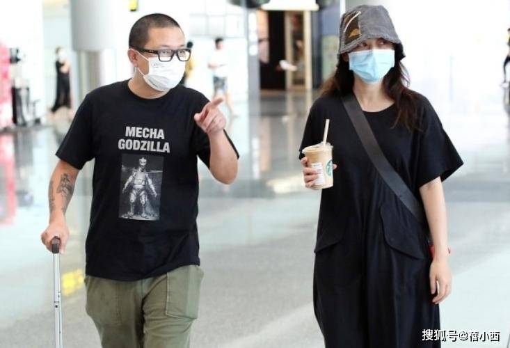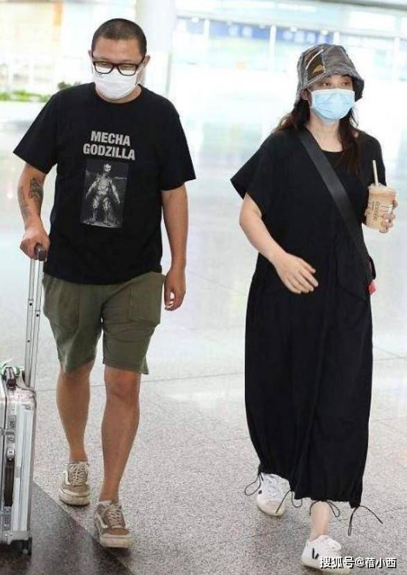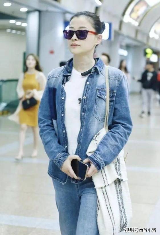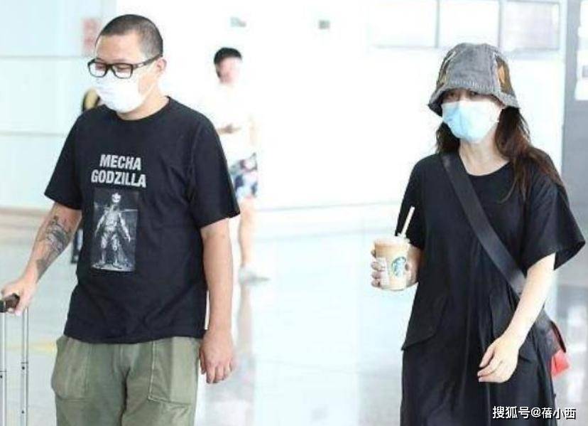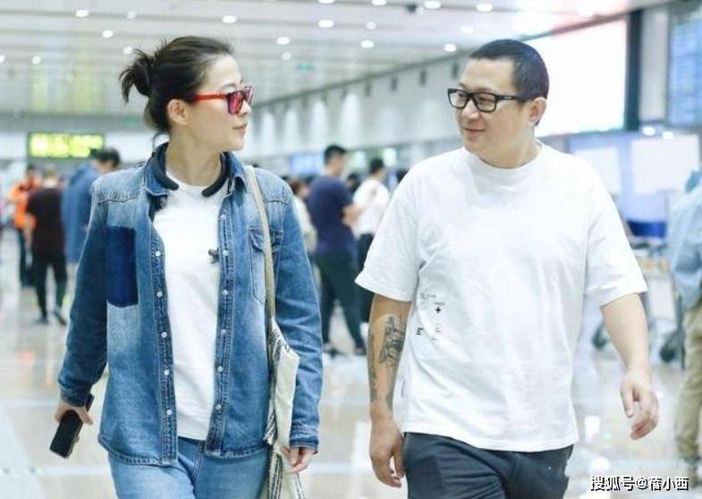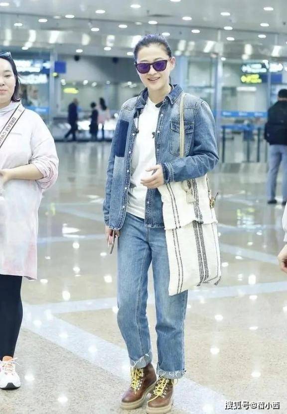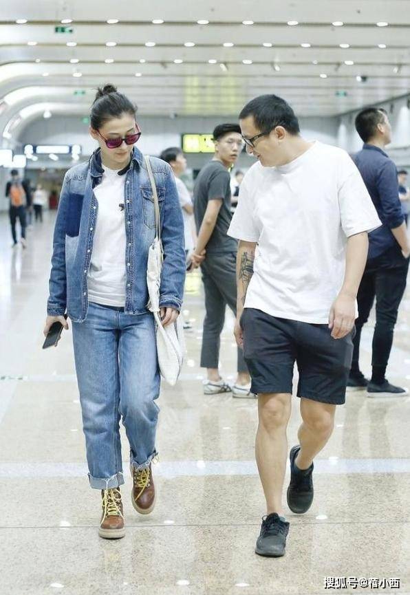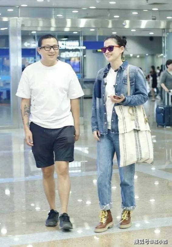 梅婷与老公现机场,穿牛仔套装+短靴如女王,小11岁的他像跟班