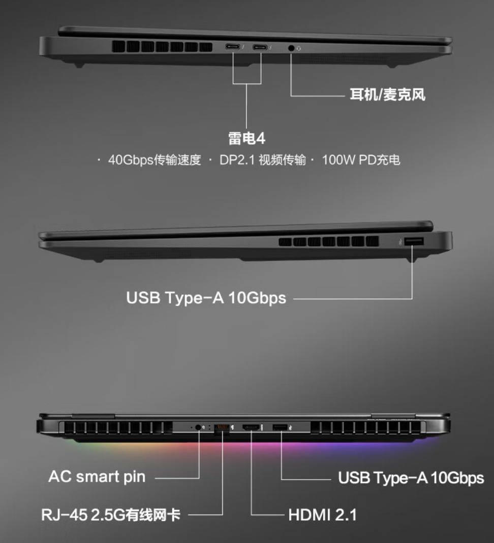 最后,让我们看看它“丰富到夸张”的接口配置。左侧是两个满速的雷电4接口,支持USB4 40Gbps、100W PD充电和DP 2.1/HDMI 2.1视频输出。后侧还有一个HDMI 2.1、一个USB-A 3.2 (10Gbps) ,以及RJ45 2.5G网络接口!你可以用一根雷电4线连接你的8K显示器和扩展坞,也可以用网口连接你的NAS,享受内网传输速度。这才是真正面向未来、一步到位的旗舰配置。