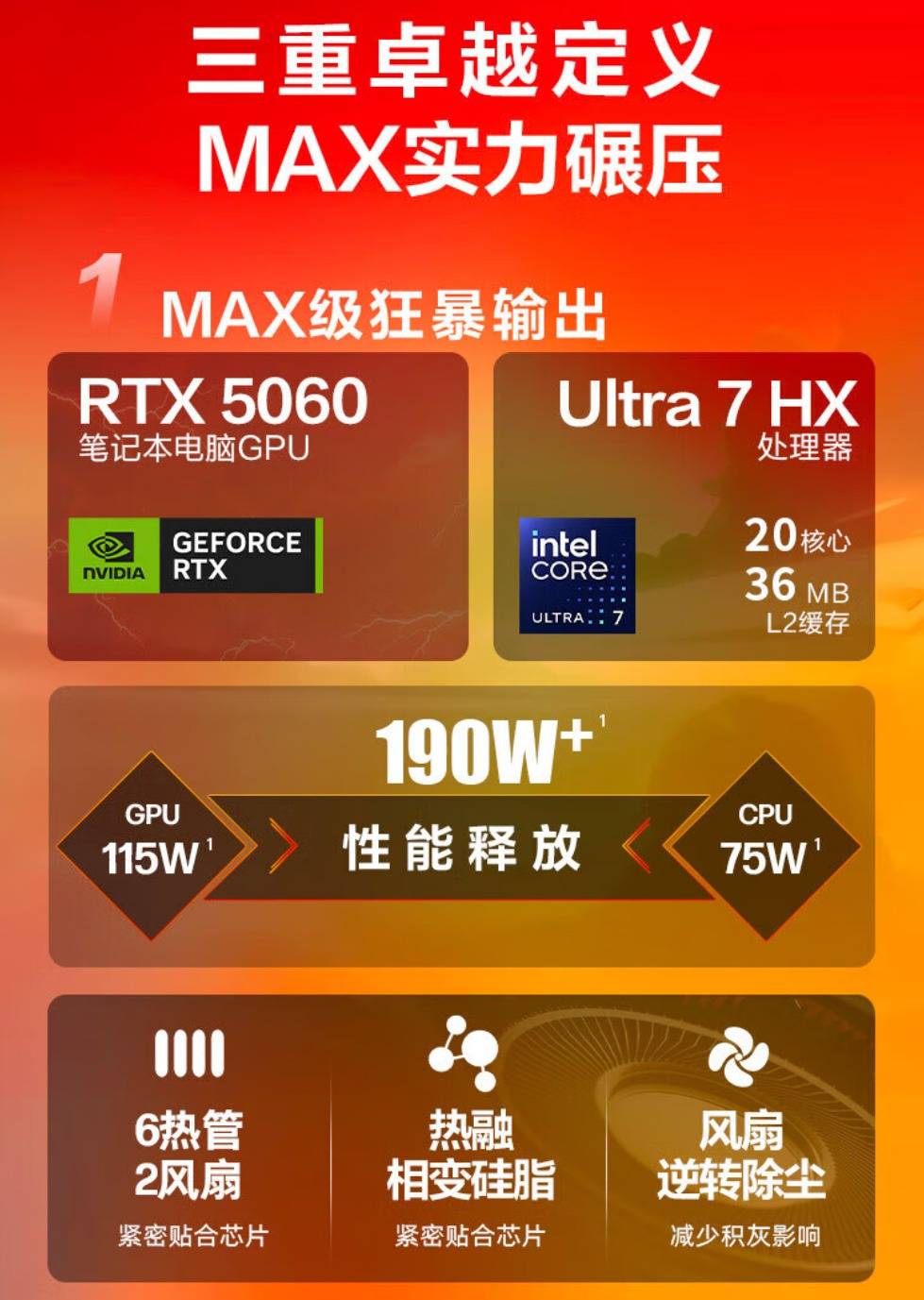 190W+的整机功耗,如何才能将其“驯服”?暗影精灵 MAX 带来了全新的“酷凉风暴”散热技术。这套散热系统堪称豪华,内部采用了6热管与2风扇的强大散热模组,确保热量能够被迅速带走。更关键的是导热介质,它在CPU和GPU上均使用了热融相变硅脂。相比传统硅脂,这种先进材料的导热系数更高,热量传递效率实现了质的飞跃。