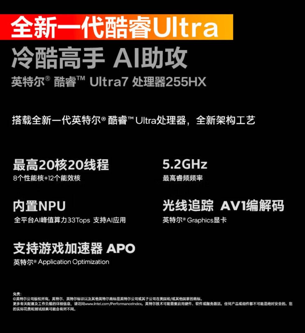 当你正在直播一款3A大作,同时后台开着直播推流软件、语音聊天工具和十几个浏览器标签页。在过去,这足以让任何游戏本“精疲力尽”。但现在,效率核心从容处理所有后台杂务,而性能核心则火力全开,以高达5.2GHz的睿频频率 专注于游戏本身,带来丝滑流畅、稳定不掉帧的顶级体验。这颗CPU还内置了NPU,为未来的AI应用和游戏加速器提供了坚实的硬件基础。