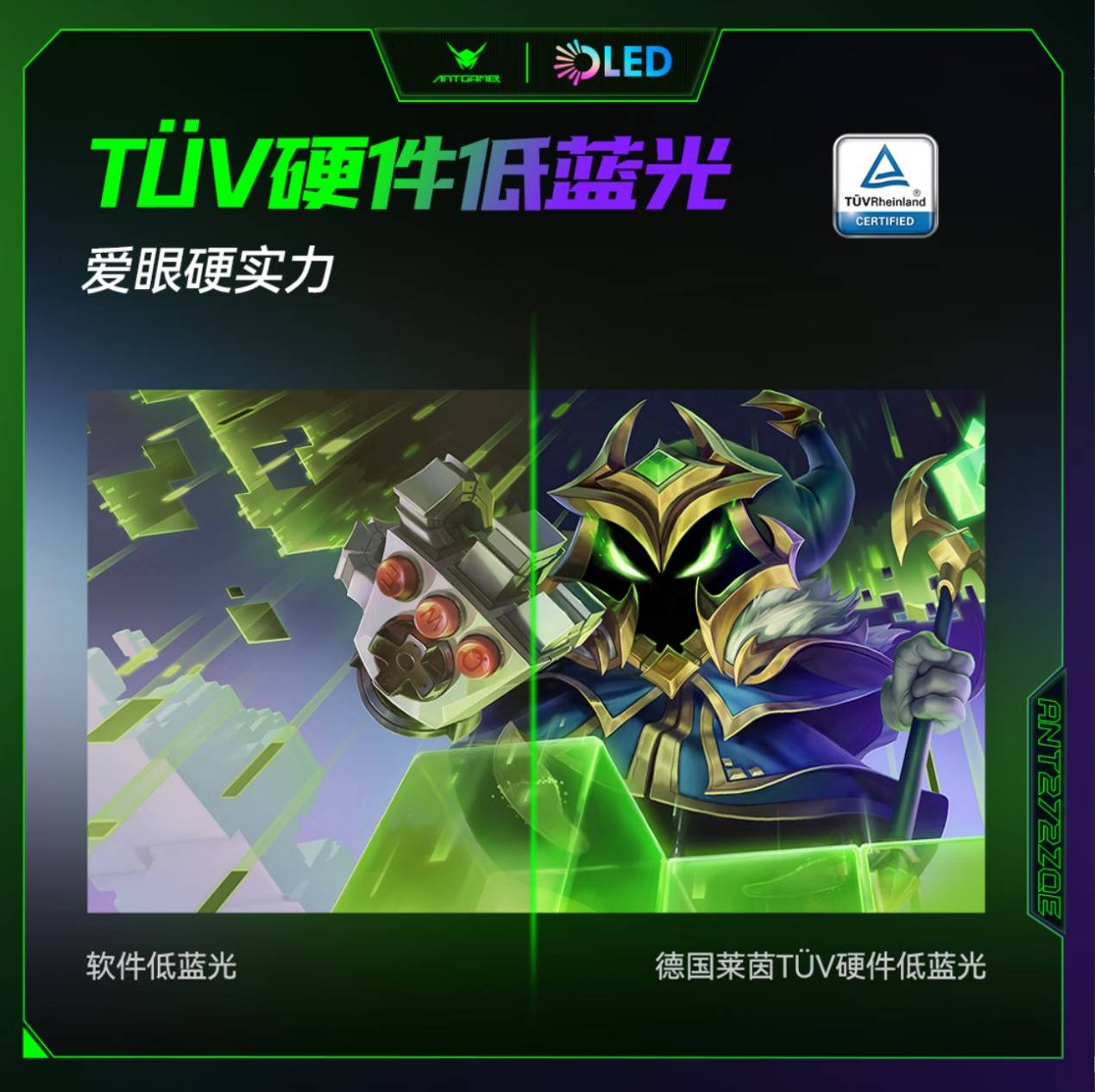 长时间面对屏幕,“伤眼”是所有玩家和办公族共同的痛点。蚂蚁电竞ANT272ZQE采用了硬件级低蓝光技术,并通过了严苛的UL认证,确保了低蓝光与无频闪设计。与传统的软件防蓝光不同,硬件低蓝光能从根源上过滤有害短波蓝光,同时保证画面色彩不发黄、不失真,极大缓解了长时间使用带来的视觉疲劳。自研的OLED面板保护机制,也避免长时间使用烧屏的风险。