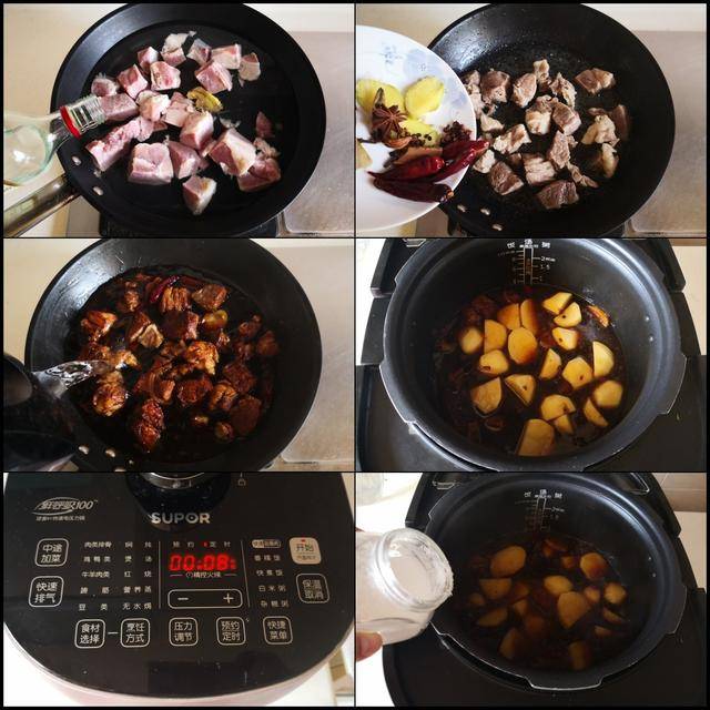 制作过程: 将土豆去皮和牛腩清洗干净后都切块备用。 烧锅水,加入少许姜片和高度白酒,冷水将牛腩块放进锅中焯出浮沫后捞出备用。 烧热锅放入适量的油,将焯好的牛腩块放进锅中煸炒干水,加入姜片和干辣椒放进锅中爆香,烹入少许料酒和酱油翻炒均匀。将炒过的牛腩放入电炖锅中,加入准备好的土豆,加入少许水,加盖后按下电炖锅炖煮牛羊肉的功能键, 最后加入少许盐和胡椒粉调味,翻炒均匀后焖上3分钟即可盛入钵中,撒上少许葱花。