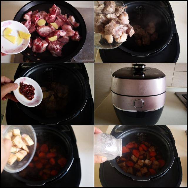 制作过程:将羊肉清洗干净后都切成麻将块大小备用。 将胡萝卜和芋头去皮切成小块备用; 烧锅水加入少许姜片,将羊肉块放进冷水锅中焯出浮沫后捞出放入电炖锅中,加入少许姜片和干辣椒放进电炖锅中,再加入1大勺郫县豆瓣酱, 加入少许料酒和酱油和少许水,加盖后按下电炖锅炖煮牛羊肉的功能键,再加入准备好的胡萝卜和芋头块翻炒均匀,再烧上5分钟后加入少许盐和胡椒粉翻炒均匀,再加入少许青蒜翻炒至变色即可。