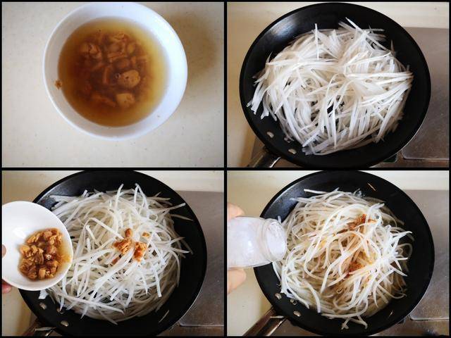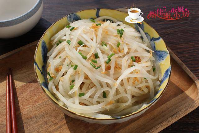 制作过程: 将瑶柱洗净后用冷水泡上十分钟; 将白萝卜去皮后切成细丝备用。 烧热锅放入适量的油,加入白萝卜丝放进锅中翻炒几下,再将泡过瑶柱和泡瑶柱的水焖煮, 将白萝卜丝煮至微微透明后加入少许盐调味,煮上一分钟后盛入钵中,加入少许葱花即可。