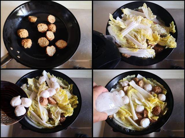 制作过程: 将大白菜洗净后手撕成小片备用; 烧热锅放入适量的油,加入准备好的肉丸子放进锅中翻炒几下,再加入准备好的大白菜放进锅中翻炒几下,加入适量的水或者高汤炖煮, 加入准备好的鱼丸一起炖煮五分钟,再加入少许盐和胡椒粉调味,盛入钵中撒上少许葱花即可。