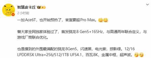 博主“智慧皮卡丘”也爆料称,一加 Ace 6T 首发骁龙 8 Gen5 + 165Hz 屏幕,与高通两年联合定义,并与游戏厂商联合优化。