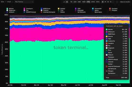 今年以来,比特币在L1完全稀释估值中的主导地位稳步上升。年初时,比特币占L1 FDV的60%,但到了第三季度末,它的主导地位已超过66%。随着比特币影响力的增加,以太坊的FDV份额则持续下降,从第一季度的19%下降到目前的15.5%。
