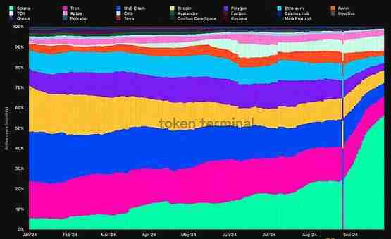 随着季度接近尾声,MAU图表显示出集中度的提高,目前Solana占前20 大L1链的56%。这一增长主要是由memecoin热潮推动的,但到了第三季度末,热潮开始降温。