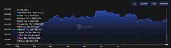 2024 年第三季度,比特币和TON的 TVL 显着增加。在此期间,减半发生,对 Ordinals 的兴趣仍然存在。在第三季度,由于投资者情绪下降和 2024 年 8 月股市崩盘,比特币的 TVL 下降了 35.6%。与 2024 年第一季度相比,TON 的 TVL 增加了 6 倍。