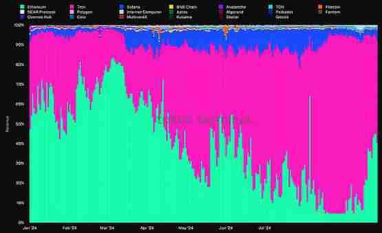 在收入方面,由于 Dencun 之后的费用影响以及 Solana 和 Tron 上活动的增加,我们看到了重大变化。在 Dencun 之后,以太坊超声波货币理论明显崩溃,8 月底,以太坊的收入份额跌至 5% 以下。与此同时,Tron 的费用收入正在稳步上升,近期平均每天达到 600 万美元。