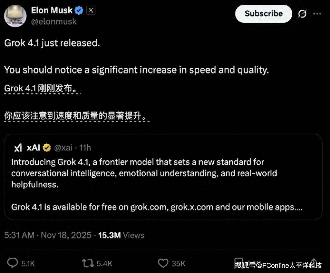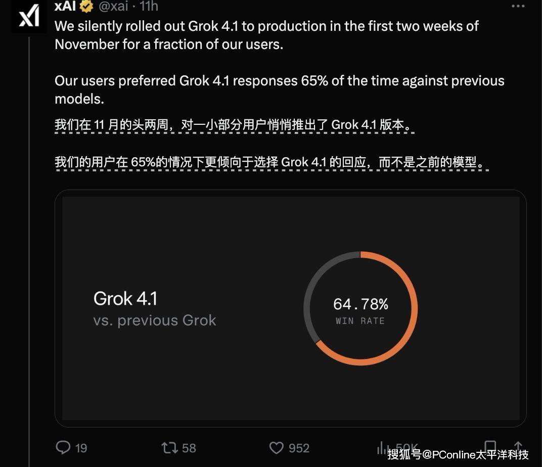 近日,马斯克的xAI公司推出了最新一代大语言模型 Grok 4.1。这次更新距离今年 7 月 Grok 4 发布仅过去四个多月,却带来了用户立刻就能感知到的显著提升。马斯克本人在 X 平台上发帖表示,大家应该会明显感觉到速度和质量的双重飞跃,而实际体验也确实如此。