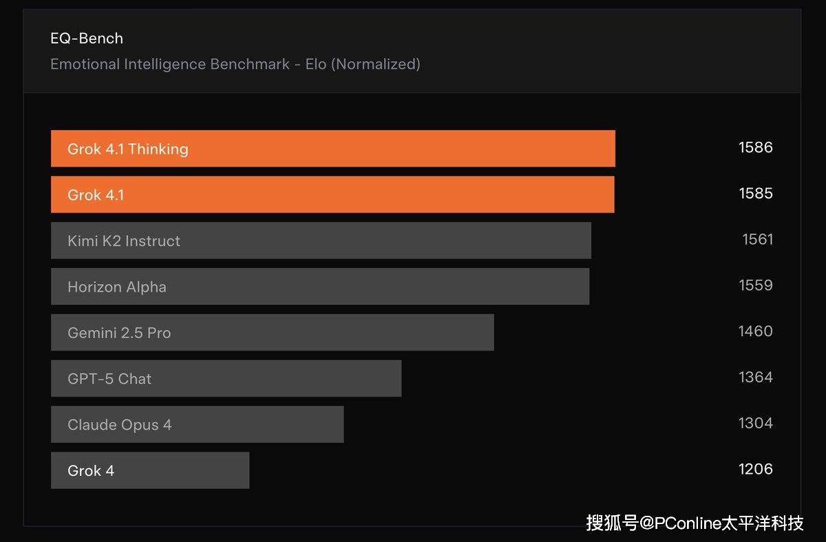 除了更可靠,Grok 4.1 在对话体验上也完成了质的飞跃。官方描述称它在创意、情感和协作交互方面表现出色,更善于捕捉用户细微意图,回复更有共情力、个性更连贯,同时保持了前代模型那种锋利又幽默的风格。在 EQ-Bench 情感智商测试中,Grok 4.1 的得分从 Grok 4 的 1206 分暴涨到 1586 分,在创意写作和人际理解维度同样领先。这让它不再只是冷冰冰的问答机器,而是更像一个真正懂你的对话伙伴。