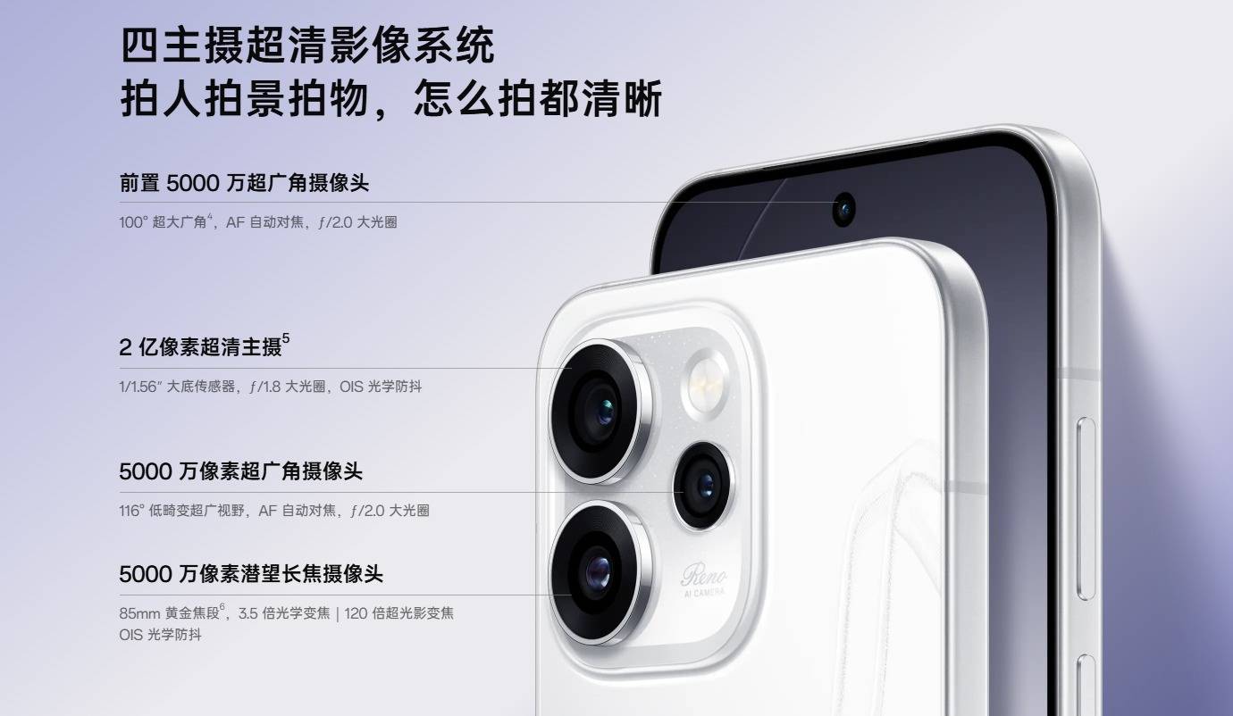 Reno15系列搭载同档最强的四主摄影像系统:2亿像素主摄、5000万像素潜望长焦、5000万像素超广角和5000万前置超广角,全焦段无凑数,远景、合影、自拍都清晰锐利。全新“出圈实况拼图”依托自研视觉大模型,可从2–9张实况照片中智能分离主体,生成具备电影感叙事的动态拼图,最高支持4K输出。超广角实况自拍、CCD闪光实况、4K实况一拍多出、前后同拍实况等功能进一步扩展创作空间,让每一刻都能自由表达。