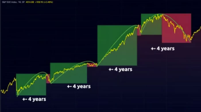 我们不能忽视标准普尔500指数在互联网周期和比特币周期中的相似之处。常规金融市场也经历了明确的 4 年周期,大部分周期处于上升趋势,而下降趋势(也称为熊市)短暂存在。