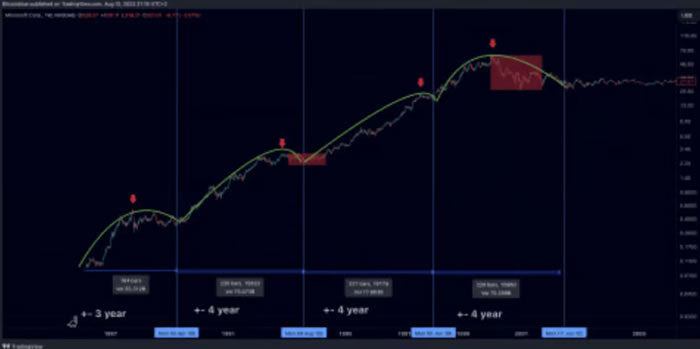 微软正在复制类似的路径——它开始于三个正常的四年周期,接着是一个颠倒的四年周期,这导致这个多年来一直处于强劲牛市的资产,出现了一个长期的熊市。