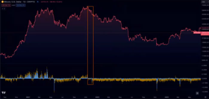 因此,我们可以使用此指标来发现市场正在交易的市场条件以及是否有任何变化。当比特币在2022年进入熊市时,第一个信号是比特币价格下跌并伴随着负资金费率,这在健康的牛市中通常不会发生。