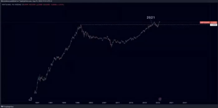 这意味着,它从那个高点之后,花了15年时间才完全恢复,并再次超过那个水平。如果我们考虑货币供应量,微软实际上需要更长的时间才能恢复,并在21年后的2021年5月突破前期高点。