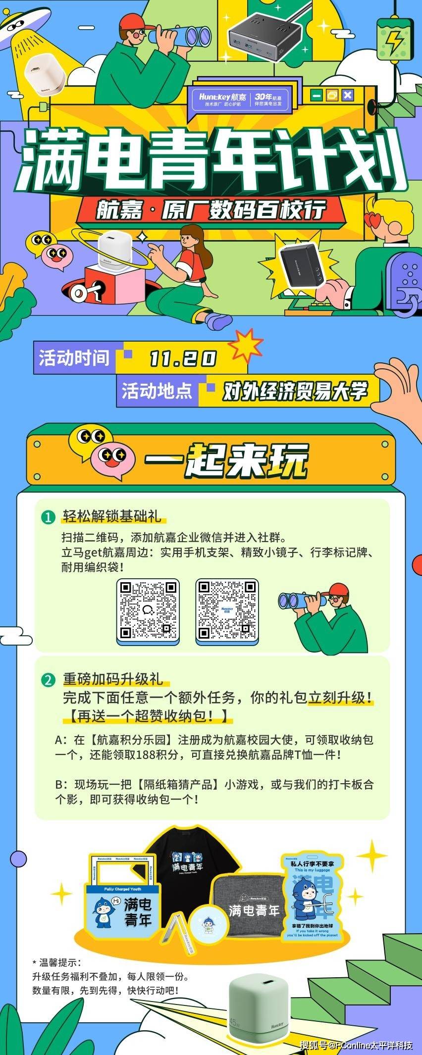 时值初冬,虽然北京的天气渐冷,但对外经济贸易大学的校园内却洋溢着别样的热情。一场为学子们量身打造的科技派对即将登场。11月20日,航嘉将与PConline太平洋科技一同走进对外经济贸易大学,启动一场精彩纷呈的“满电青年”校园行活动。现场不仅将有新潮酷炫的数码好物集中展示,还有海量福利和专属的校园大使招募计划等待大家。同学们,你们准备好迎接这场科技浪潮了吗?